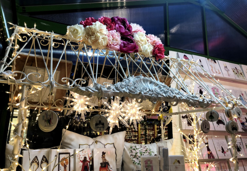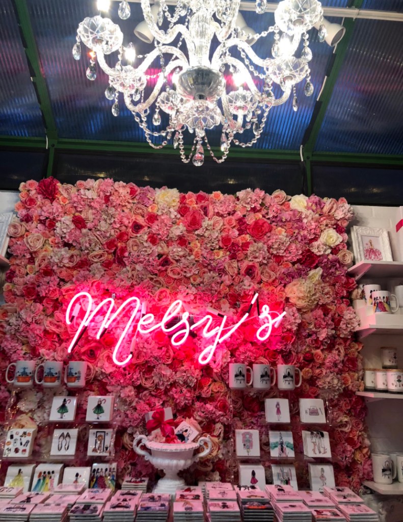天井までお花を飾り付けている可愛い雑貨屋さん