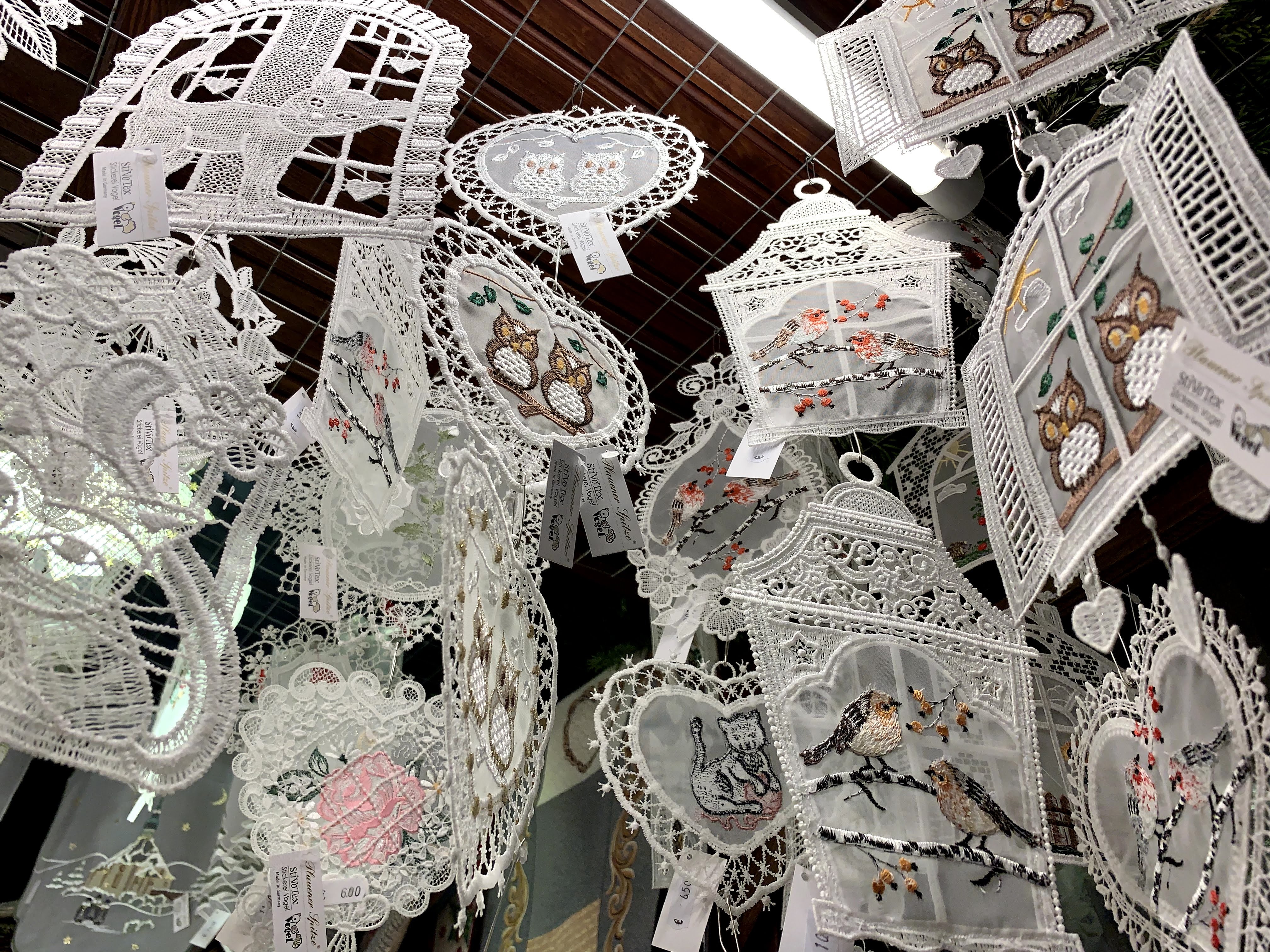 天井から鳥かごやら何やらがぶら下がっています。