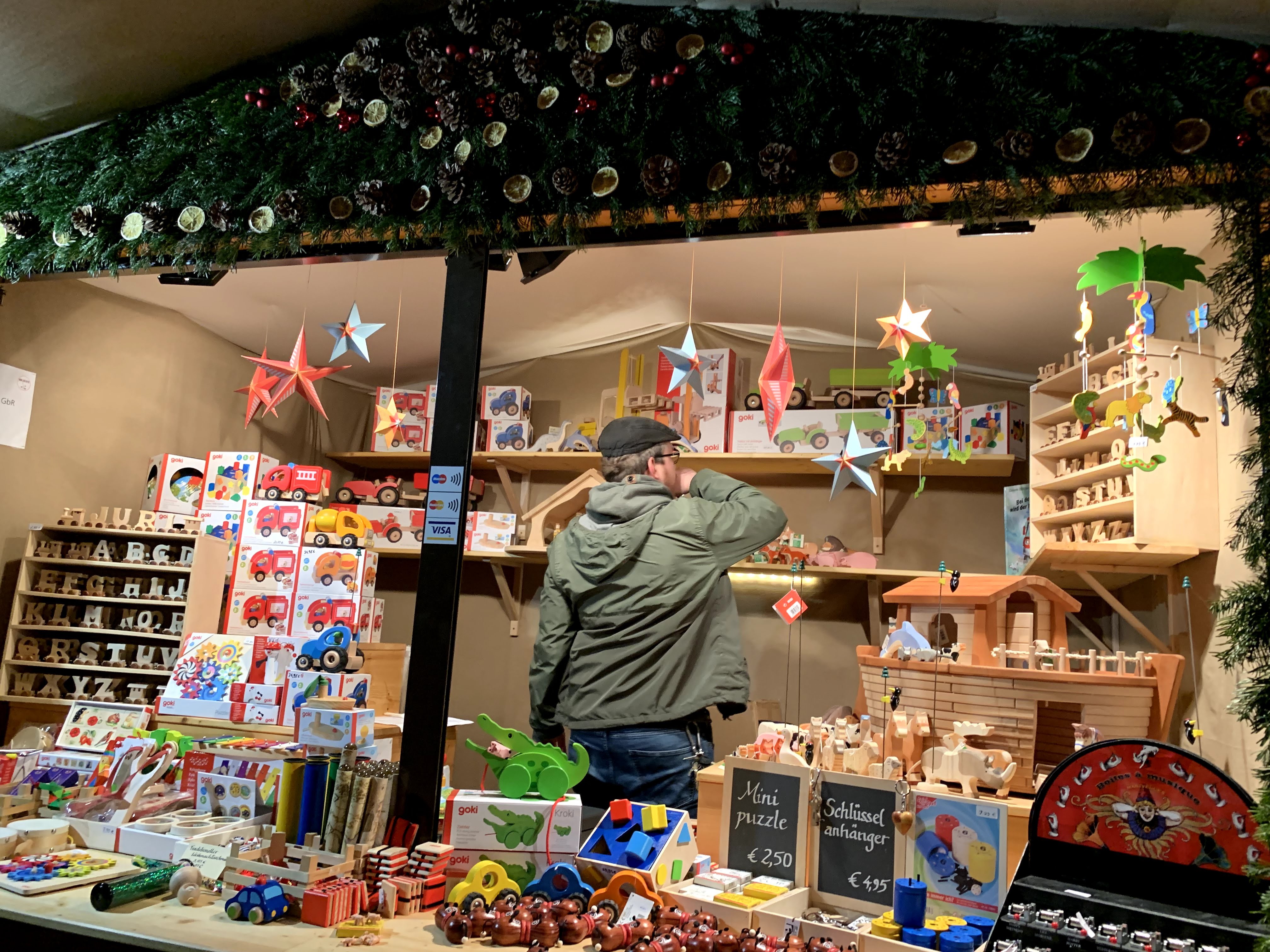 木製用品のお店。木製バッグがツリーのように吊られています🎄